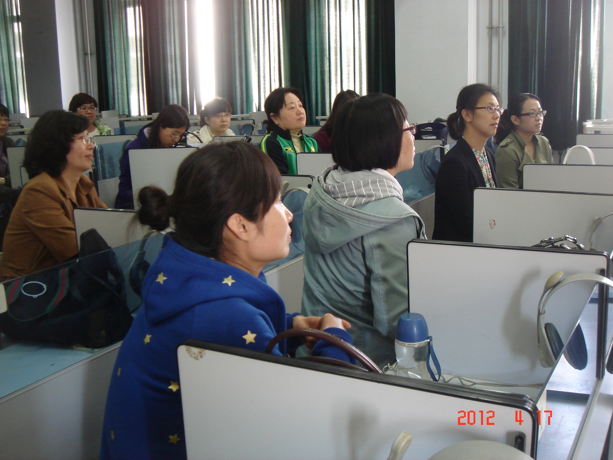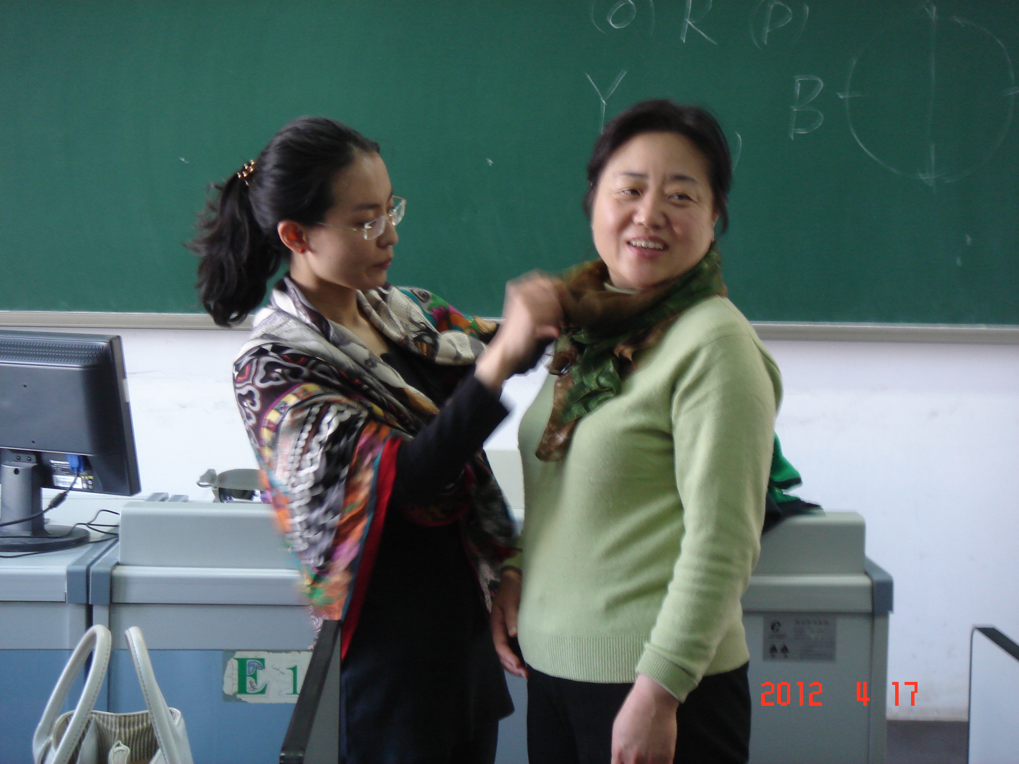 4月17日中午,动漫网站 工会分会请来艺术学院的王斐然老师为学院的女老师们做了一次有关色彩搭配的交流讲座。王老师从服装的款式、面料、色彩开始,讲到服饰与体型的搭配;然后,给每位老师发了一张“自查表”,让大家分析适合自己的色调;接着,利用带来的围巾,王老师演示了几种丝巾的佩戴方式,以及各种方式适合的场合等,还为现场戴着丝巾的几位老师现场整理,让大家看到不同的佩戴方式所产生的不同效果!
