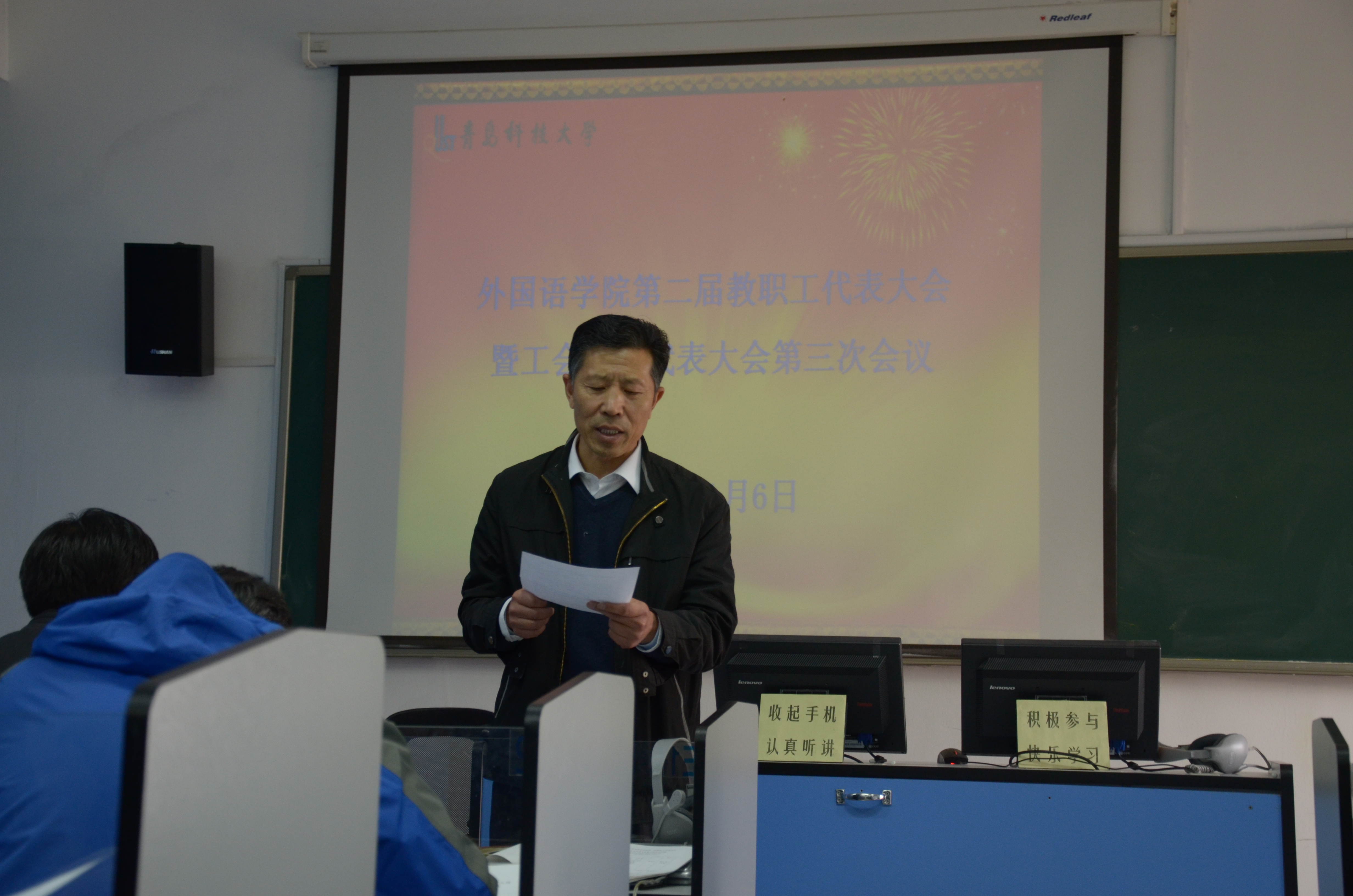 在南区3#418教室召开学院第二届教职工代表大会暨工会会员代表大会第三次会议。学校工会副主席李小华同志出席会议,院长姜德杰主持预备会议,党总支书记许桂锋主持正式会议。
