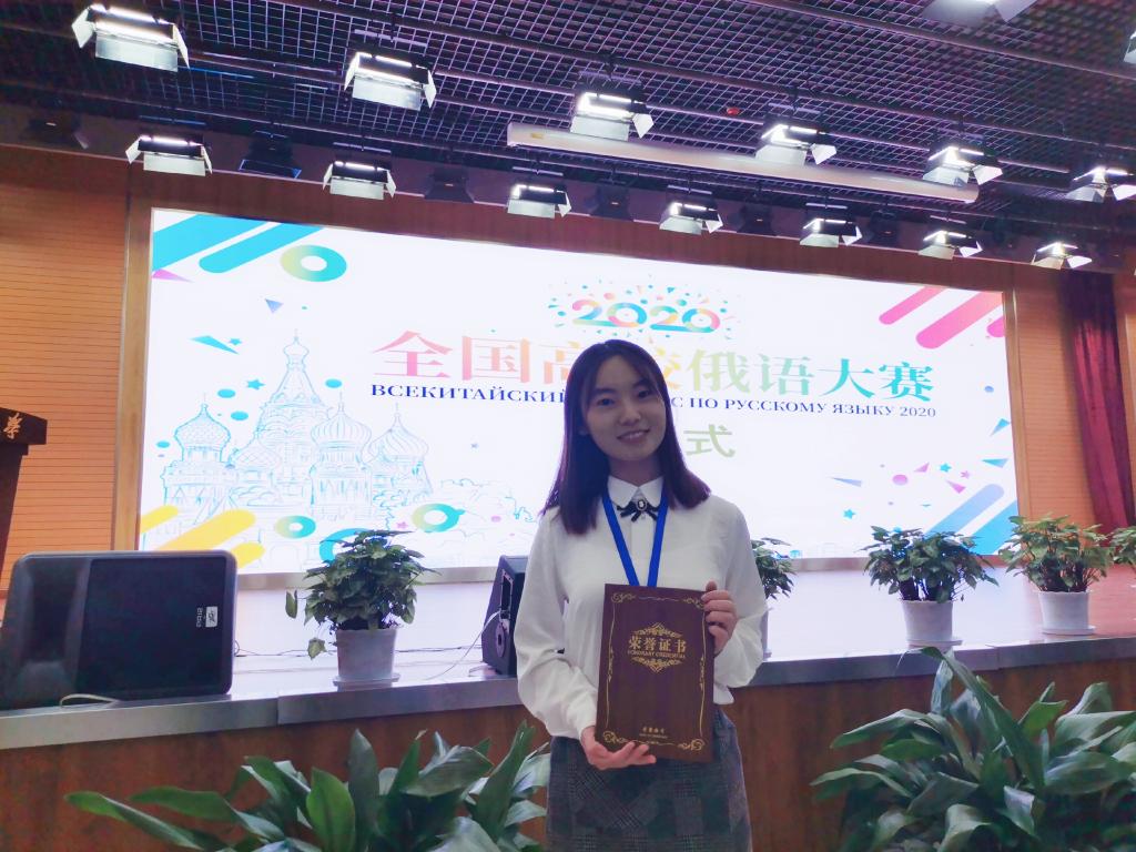 俄语系学生在此次俄语大赛上再创佳绩。2017级卢冬雪同学获得高年级组三等奖,同时获得国家留学基金管理委员会秘书处全额资助赴俄罗斯攻读学位资格。2019级金黎杰同学获得低年级组优胜奖。