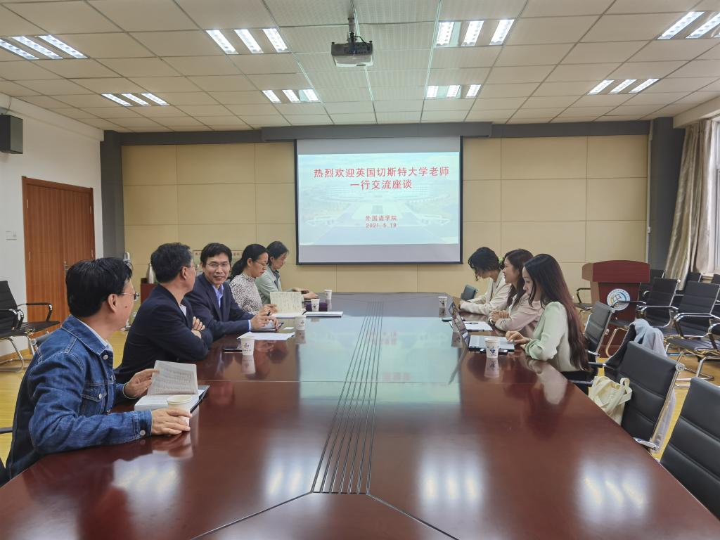 尹洪山代表学院对切斯特大学客人的到访表示欢迎。尹洪山对学院的历史发展、办学经历等进行了简要的介绍,并着重从学科特色、专业建设、课程设置、发展成就及国际交流等方面介绍了学院发展情况。他表示,中外合作办学是青科大鲜明的办学特色,此次会谈是学院坚持以聚焦人才培养服务为目标的重要举措,也是学院创新和优化人才培养模式的重要体现。学院将以此为契机持续引进国外优质教育资源与学校优势特色学科开展联合办学,探索中外合作办学育人新方式、办学新模式。