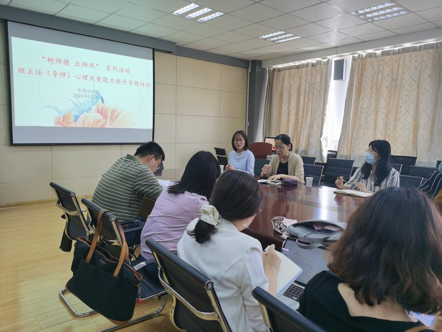 “树师德 正师风”系列活动——教师心理关爱能力提升专题培训在学院517会议室进行,学院邀请校心理健康教育与研究中心主任李海玲为学院全体系部主任、班主任(导师)进行相关培训。