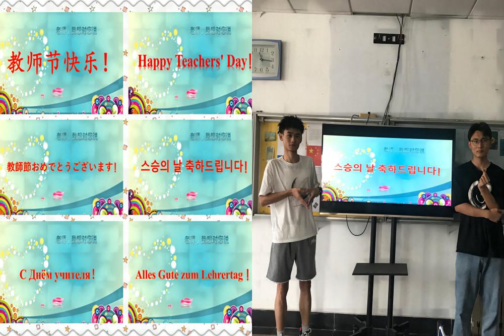 来到四楼语音室,电子提示屏上运用五国语言滚动展示着“教师节快乐”的字样,突出了学院的专业特点;配合着《听我说谢谢你》的背景音乐,同学们下课后纷纷前来“比心”打卡。