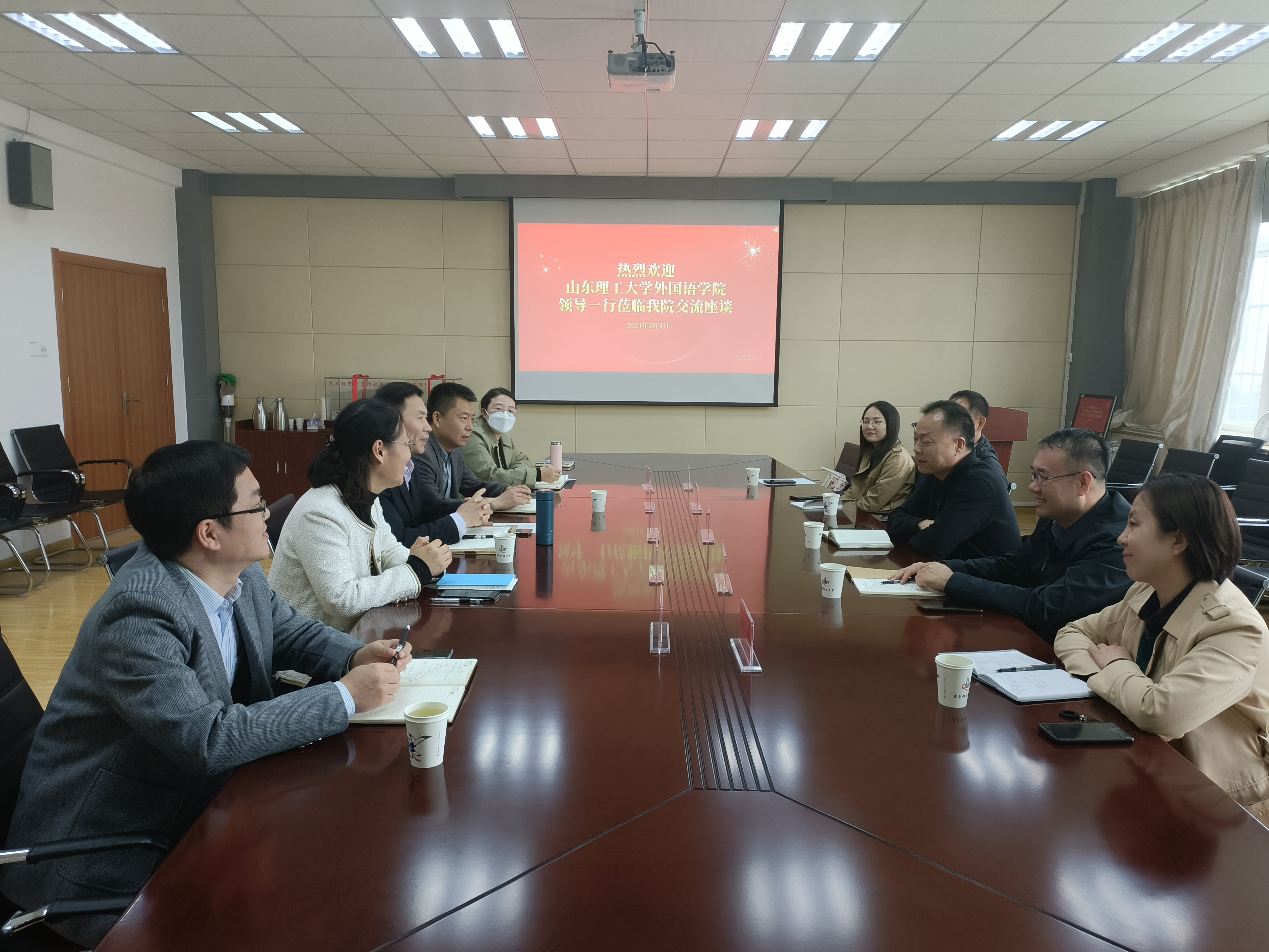 院长牛书田、党委副书记宋伟、综合办公室主任鹿宏、英语教育系主任彭静和辅导员王惠一行来学院调研交流。学院党委书记曲斌艳、院长尹洪山、党委副书记兼副院长刘尧、副院长刘靖、学工办主任刘妍君参加交流。