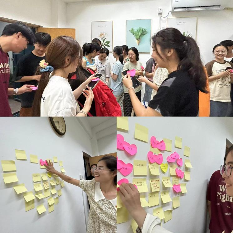 根据“9·25”心理健康周安排,“心语”协会成员组织在场同学开展了“拥抱新学期 从心开始”心理健康趣味活动。首先,让同学们写下了自己对“谈心谈话室”的祝愿,并将写下自己美好愿景的纸条贴在了“谈心谈话室”的墙上,以表达对“谈心谈话室”成功揭牌的激动与喜悦。随后,进行“心灵连线”的趣味环节,同学们互相寻找与自己手中匹配的纸条,连线成功后将其共同贴在墙上。通过这一互动环节,同学们增强了心理健康知识的储备,也更能敞开心扉进行交流。