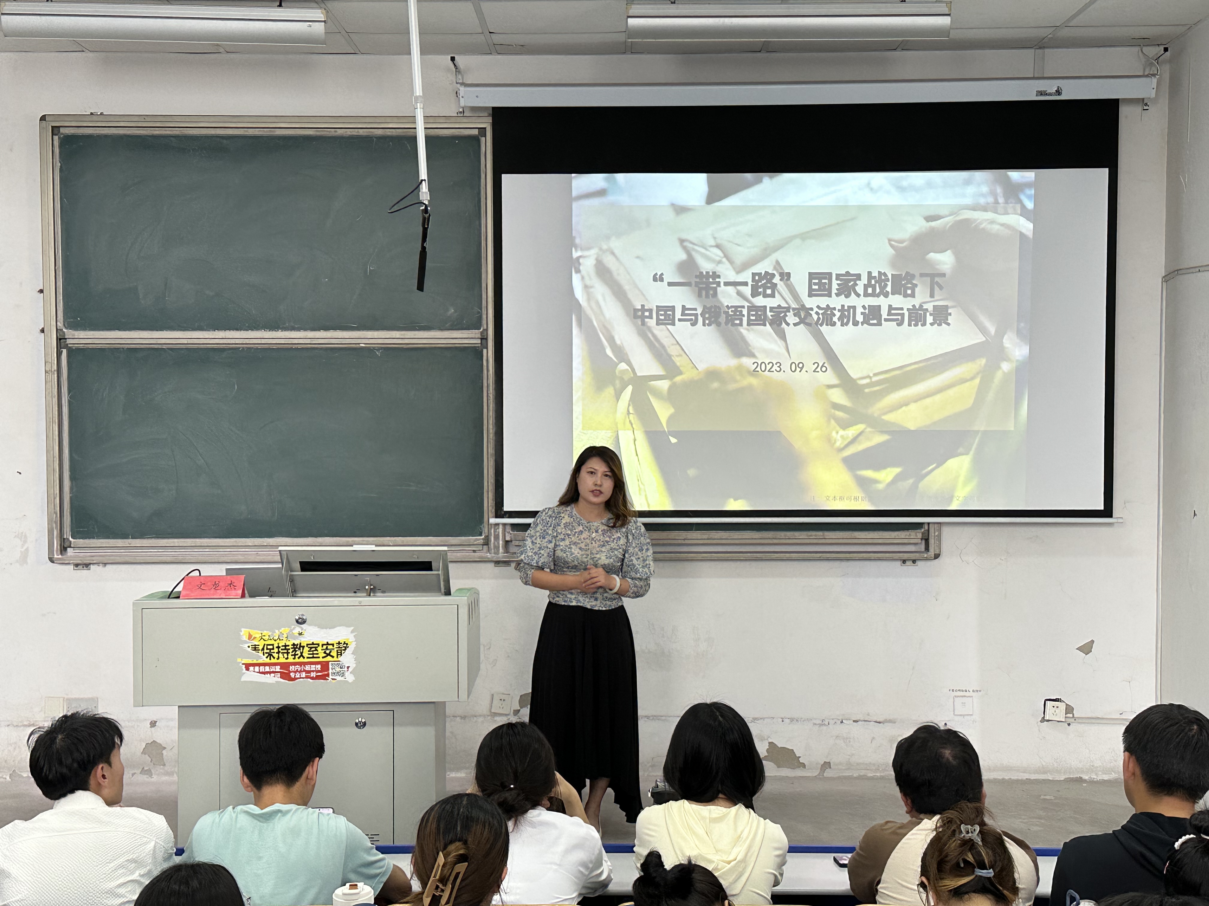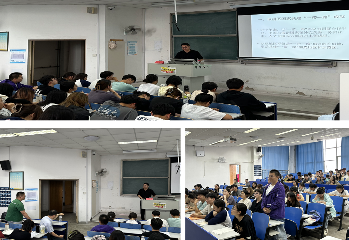 学术副院长赵洪娟老师向同学们介绍了主讲人。报告会上,文龙杰教授从“一带一路”倡议的国际背景,俄语国家共建“一带一路”成就以及中国与俄语国家邻近,互利合作基础好、潜力大等独特的发展机遇等方面展开报告,深入浅出地介绍了十年来中国已与多个国家和国际组织签署了共建“一带一路”合作文件,积极与欧亚地区的俄语国家共建 “一带一路”成果颇丰,为共建国家人民生活水平的改善和提高提供了强大助力。报告会期间,文龙杰教授多次和学生进行深度的交流互动,现场学术氛围浓厚,开拓了外院师生的国际视野。