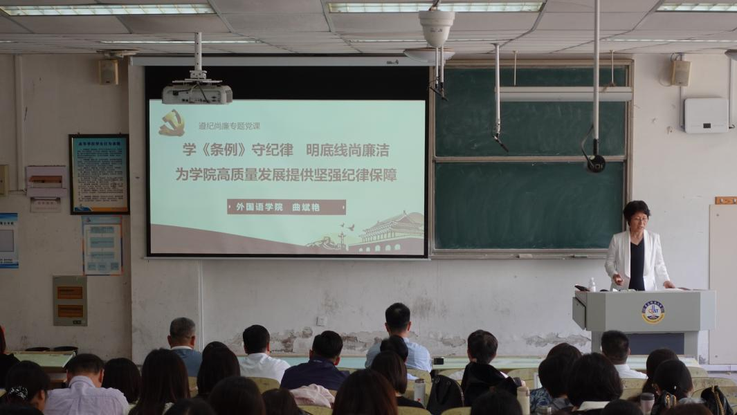党委书记曲斌艳在弘毅B101以《学条例守纪律 明底线尚廉洁为学院高质量发展提供坚强纪律保障》为题讲授“遵纪尚廉”专题党课,学院全体师生党员参加。