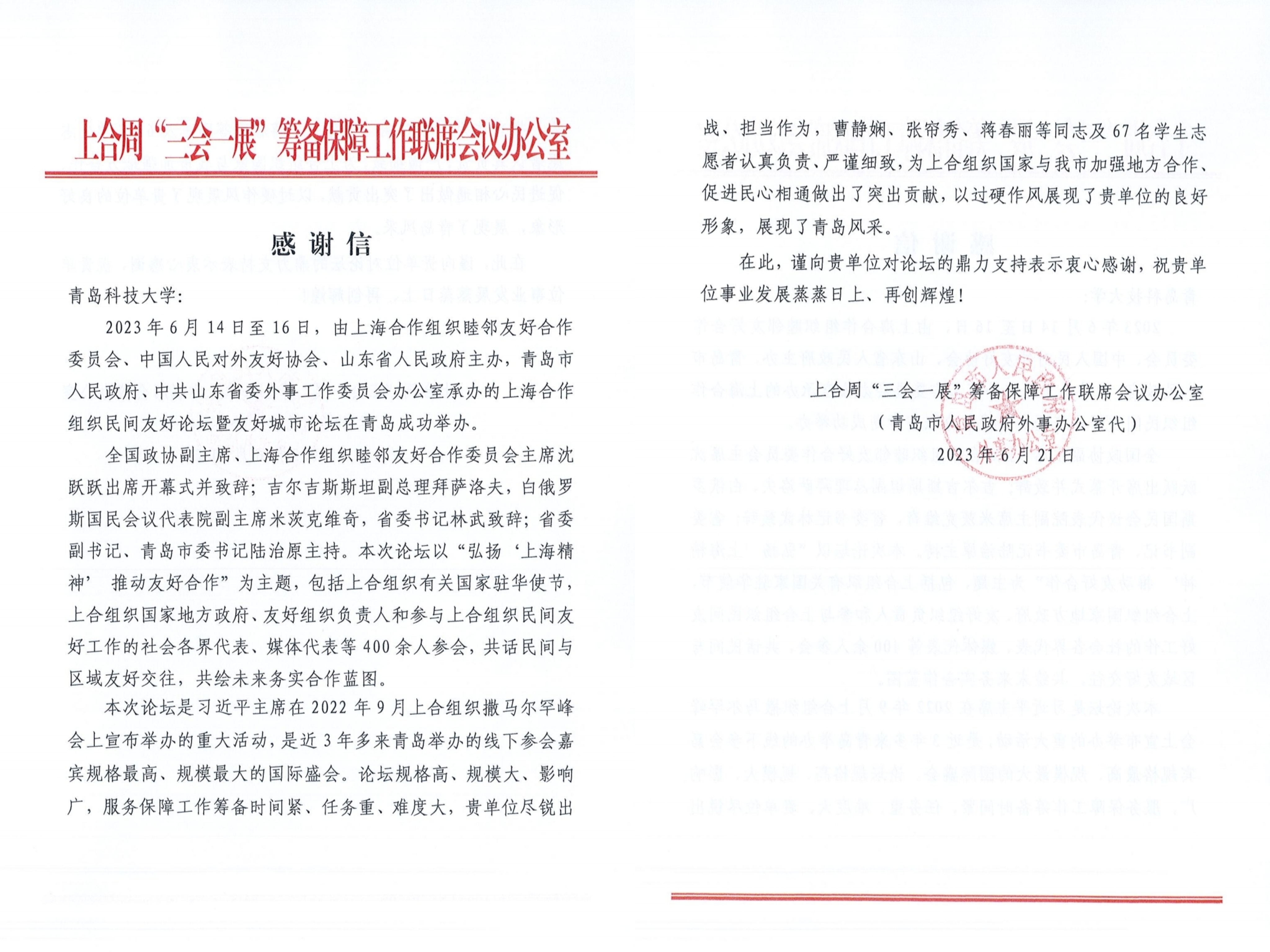 收到青岛市外事办感谢信,对学校给予上海合作组织民间友好论坛暨友好城市论坛的鼎力支持表示感谢,对动漫网站