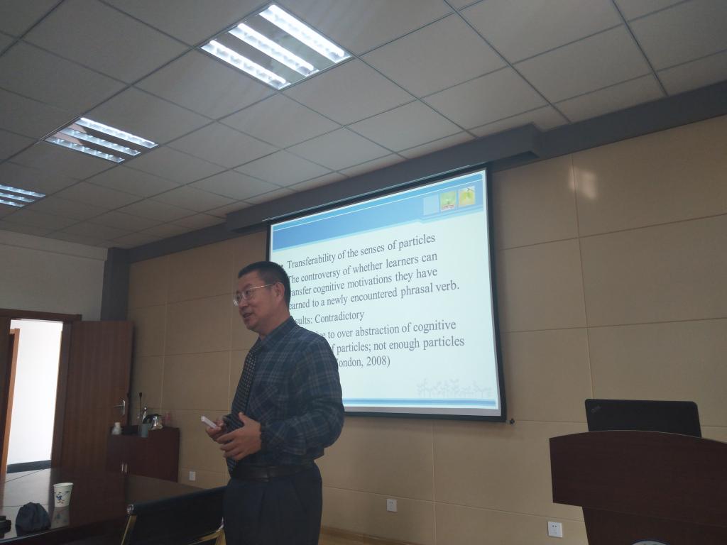 研究生论坛,为大家做了《认知语言学在外语教学中的应用》专题讲座。讲座由院长尹洪山主持,副院长吕耀中、康宁与部分教师和研究生聆听了讲座。