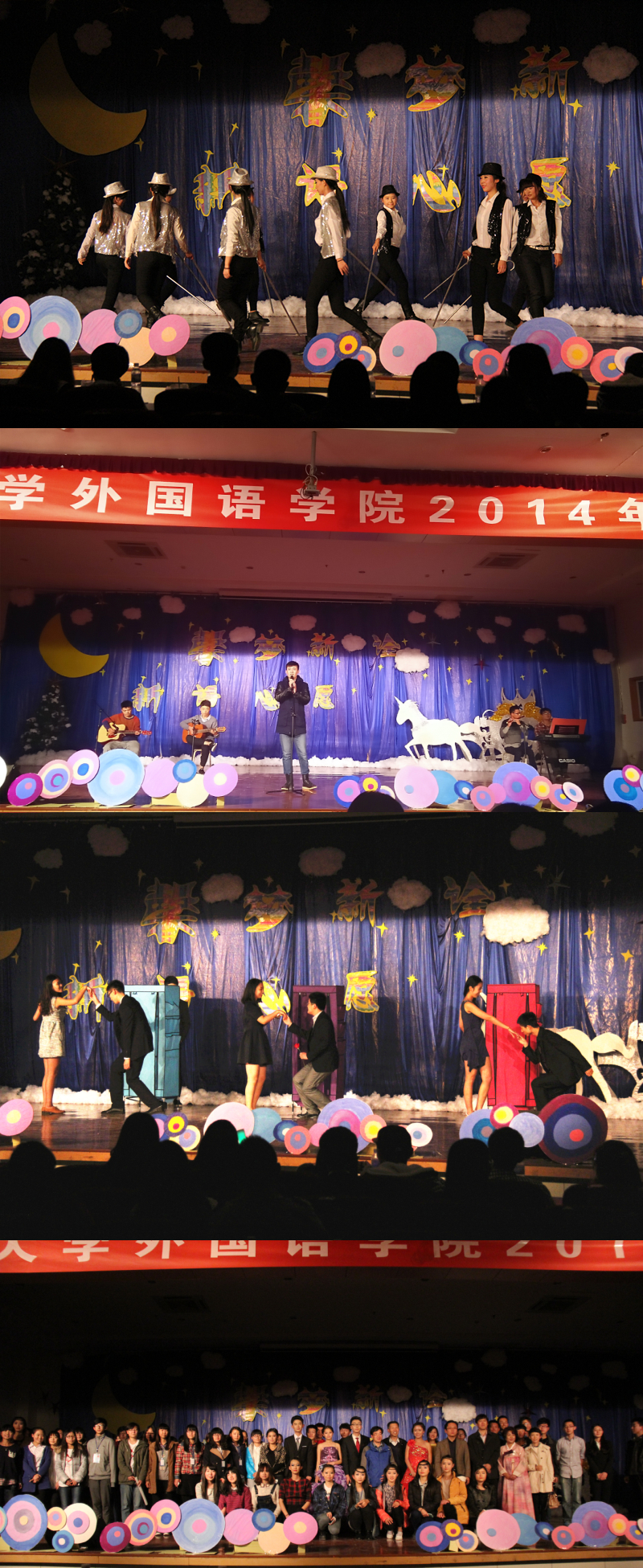 将自身的特色展现的淋漓尽致:日语、韩语外教身穿自己本民族服装,大家带来了的动听歌曲感染了全场;俄国外教别出心裁地将俄罗斯民族歌曲《喀秋莎》与《小苹果舞》结合起来,创意十足;德国外教及德语专业的学生们借这个舞台表演《执灯相伴》来庆祝本国的圣马丁节,寓意深刻。他们的节目不仅向全校展示了动漫网站