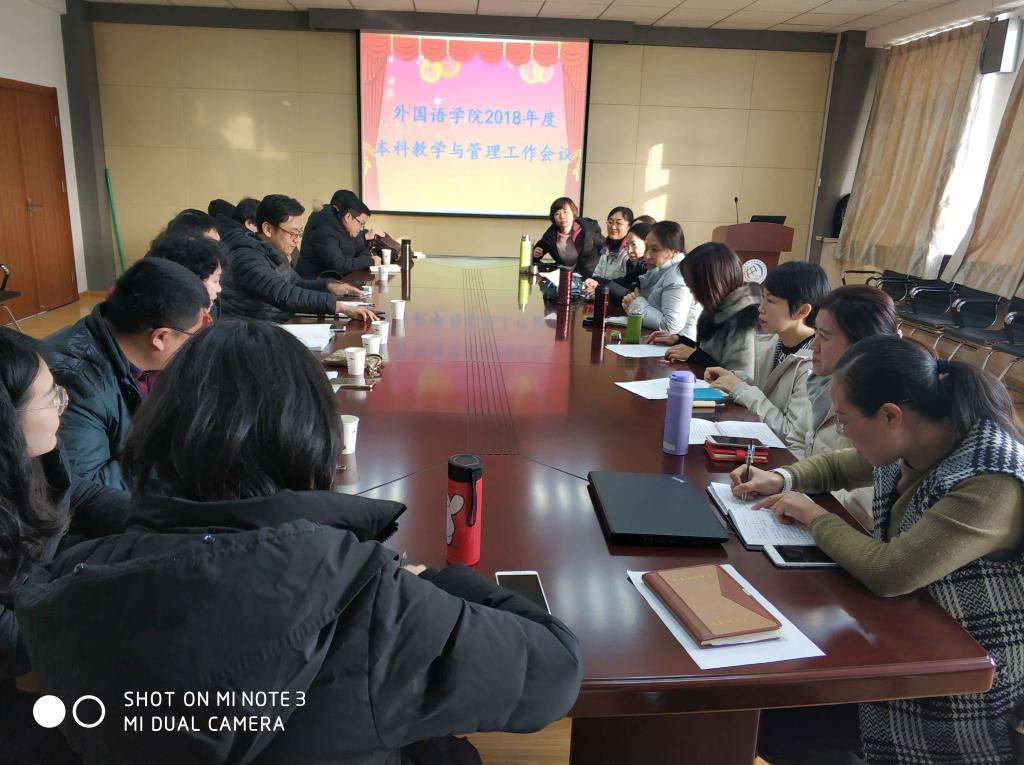 2018年度教学与管理工作会议在外语楼517会议室召开。院长尹洪山、党总支书记张洪坤、副院长任素贞、党总支副书记兼副院长宋飞、院长助理刘靖、各系(部)主任及学院全体教学管理人员出席了会议。会议由张洪坤主持。