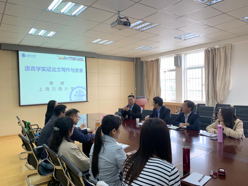 报告会上,常辉教授讲述了论文类型与选题、文献梳理、研究设计、数据收集与处理、论文撰写与投稿以及审稿意见的处理等内容。常教授首先提出论文写作需要大量阅读文献和把握本领域的国际主流及前沿课题的重要性,并结合自己的研究经历,从二语词汇与一语词汇存储关系、大学英语分级教学的设置与效果、特殊人群语言特征研究等选题为例,与大家分享了研究心得。随后,他以an eye movement study of overt and null subjects in L2 Chinese为例,讲述了如何进行研究设计、数据采集和处理,并强调研究思想是一项研究的灵魂,不必一味追求先进的工具和统计方法。最后,常教授指出论文修改在研究中的重要性并讲述了投稿过程中需要注意的事项。