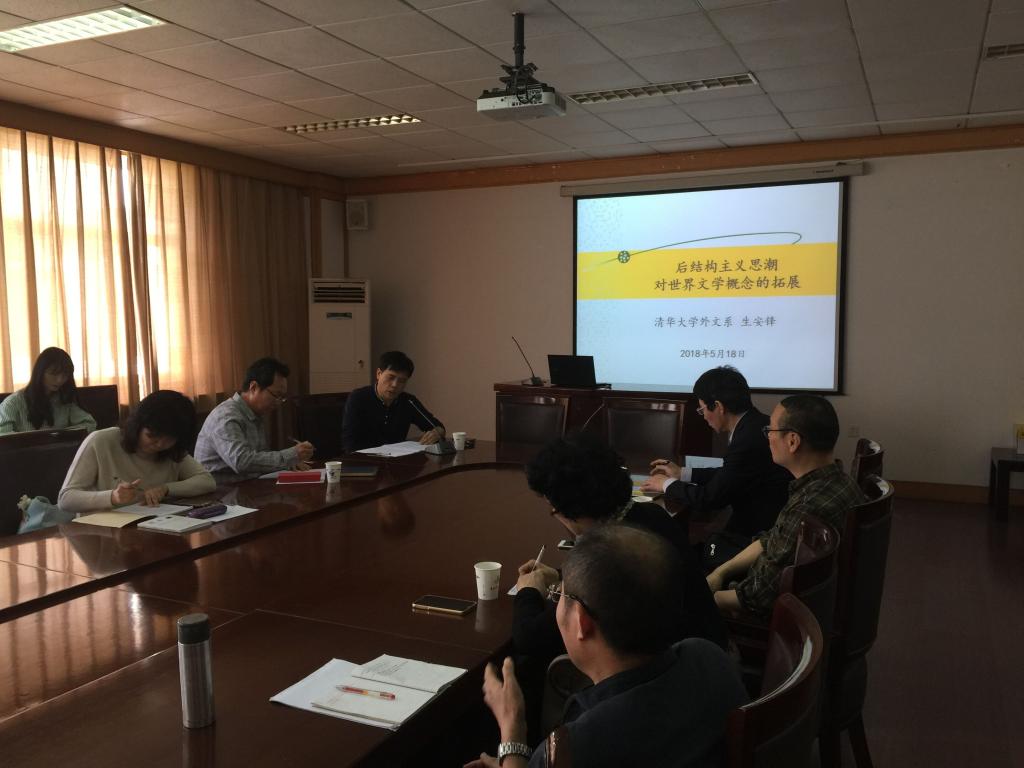 生安峰教授首先重点阐述了后结构主义思潮对新历史主义和后殖民主义的影响和建构,以及对世界文学概念的拓展与反思,列举了以格林布拉特、希利斯·米勒、霍米·巴巴以及法因曼为代表的著名学者如何推动文学从修辞学的“内部”研究向对文本“外部”联系的文化诗学研究,阐释了世界文学概念的拓展与经典的重构。生教授以广博的知识和开阔的视野,以作家观点及其作品和编撰的文集为例,清晰缜密地论证了后结构主义思潮,如何开放经典、守护经典,体现文学与学术作品民主、开放、包容和多样化,建构从传统的欧洲本土主义过渡到多样化的多元中心的世界文学;从以男性作家为主的单数世界文学过渡到男、女性作家平等共存的复数世界文学。