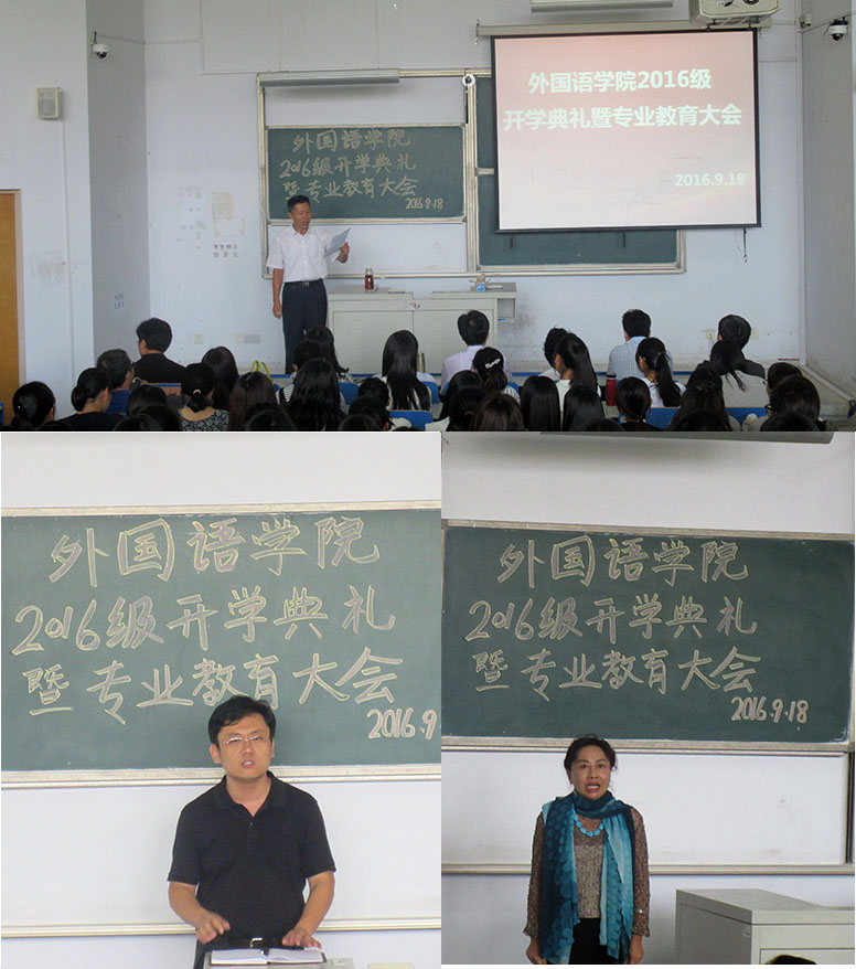 2016级新生开学典礼暨专业教育大会在弘毅楼E403隆重举行。外国语党政领导姜德杰、许桂峰、任素贞、吕耀中、尹洪山、各系主任以及来自全国各地的236名新生参加了本次大会。会议由副院长兼党总支副书记张洪坤主持。