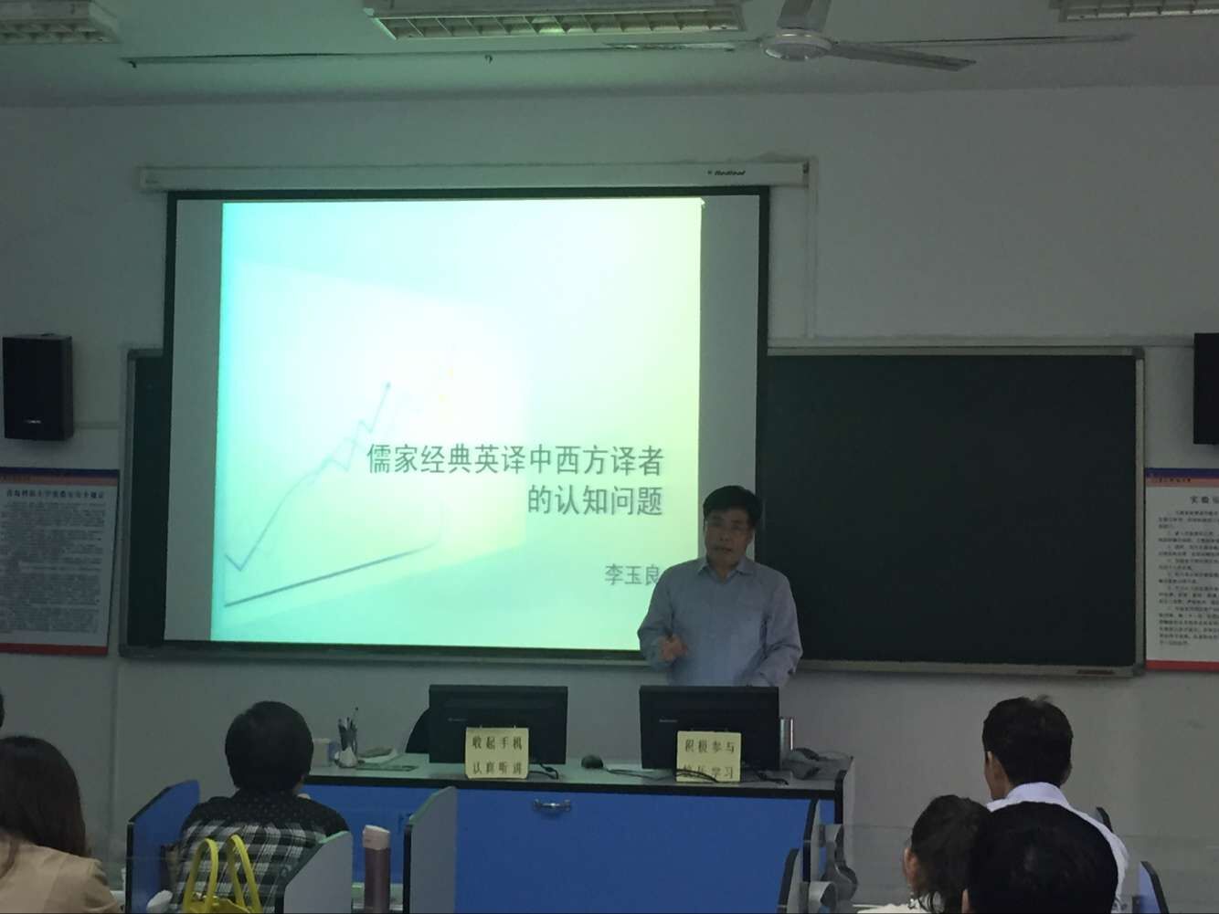 在语音室418举办了学术论坛第一讲。本次论坛由李玉良教授主讲,主题为“西方译者儒家经典英译中的认知问题”。院长尹洪山、副院长任素贞及学院部分师生参加了此次论坛。论坛由副院长吕耀中教授主持。