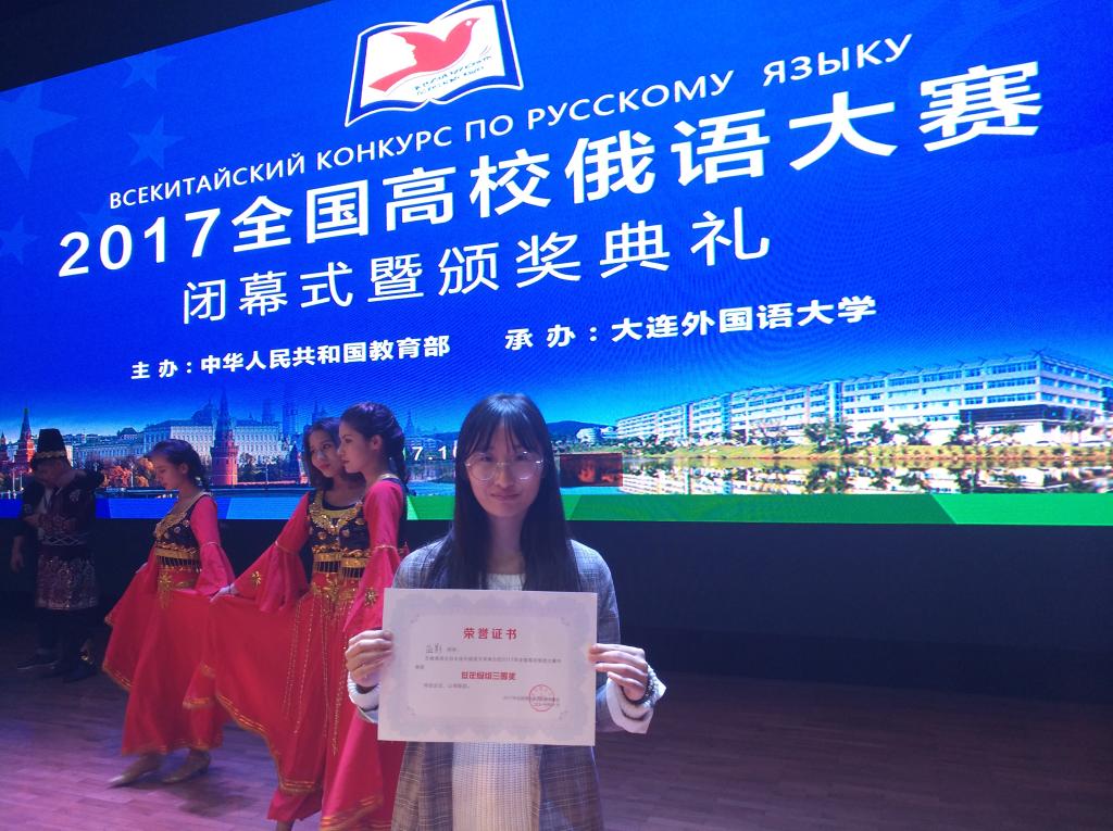 10月16日,2017年全国高校俄语大赛在大连外国语大学圆满落下帷幕,中国人民大学、南开大学、北京外国语大学、山东大学、广东外语外贸大学等151所开设本科俄语的高校(全国共153所)参加了此次比赛,我校俄语161班益影同学代表学校参赛并获得全国三等奖的好成绩,将接受教育部留学基金委资助,赴俄罗斯留学一年。
