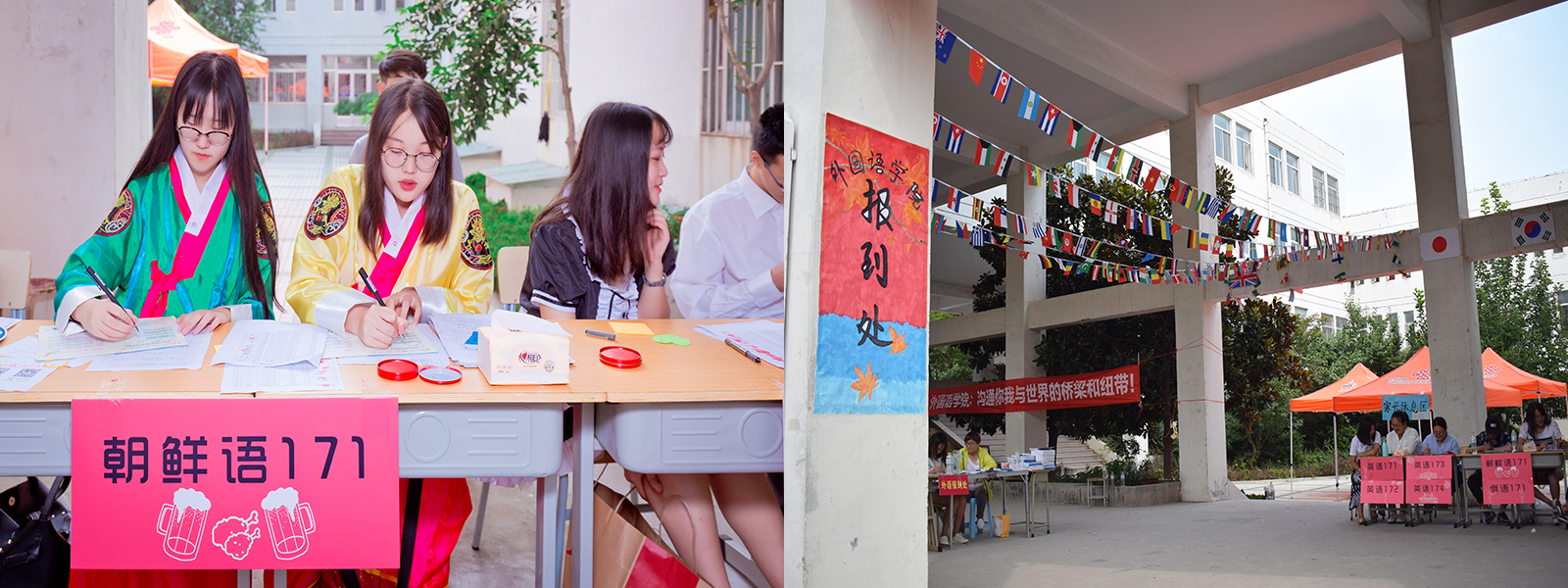 迎新过程中将文化迎新作为重要内容,现场张贴了不同国家的国旗、代表不同国家的卡通人物等营造氛围,办理新生报到手续的同学均穿着各国民族服装,并将新生的名字翻译成所学语种制作成新生名单墙张贴在迎新现场,帮助新生树立国际视角。