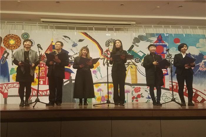 院长姜德杰,党总支书记许桂锋,副院长任素贞、尹洪山、吕耀中,党总支副书记张洪坤,分团委书记赵含,俄语系主任赵凤彩,日语系主任王维幸、韩语系主任赵爱仙、德语系主任巫莉丽,外教崔柔永、妮娜,任课老师冯爽,分团委老师贾明明、于倩。
