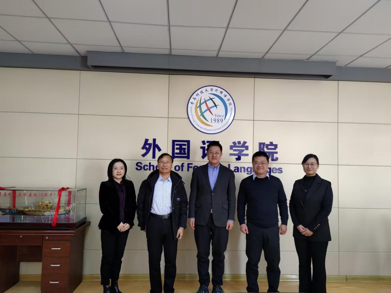 与译国译民集团校企合作座谈会暨授牌仪式在学院517会议室举行,院长王灏、副院长康宁、MTI教育中心主任房钰、译国译民集团董事长林世宋及译国译民集团山东分公司高校部总监陈淑玲参会。