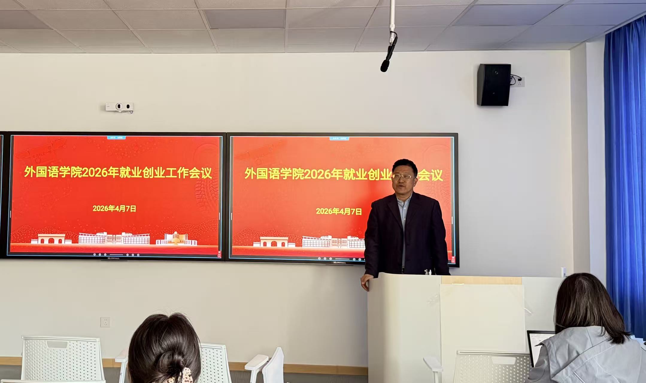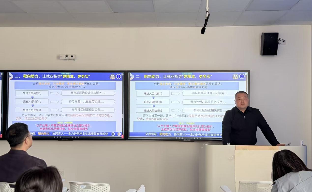 马寒通报了学院近两年毕业生就业情况及2026届就业现状,客观分析了当前毕业生就业面临的形势与挑战,并就下一步就业工作分享三点意见:一是转变观念,主动适应就业新形势;二是认清形势,增强就业工作的紧迫感与责任感;三是把握节点,精准推进各项工作落实。