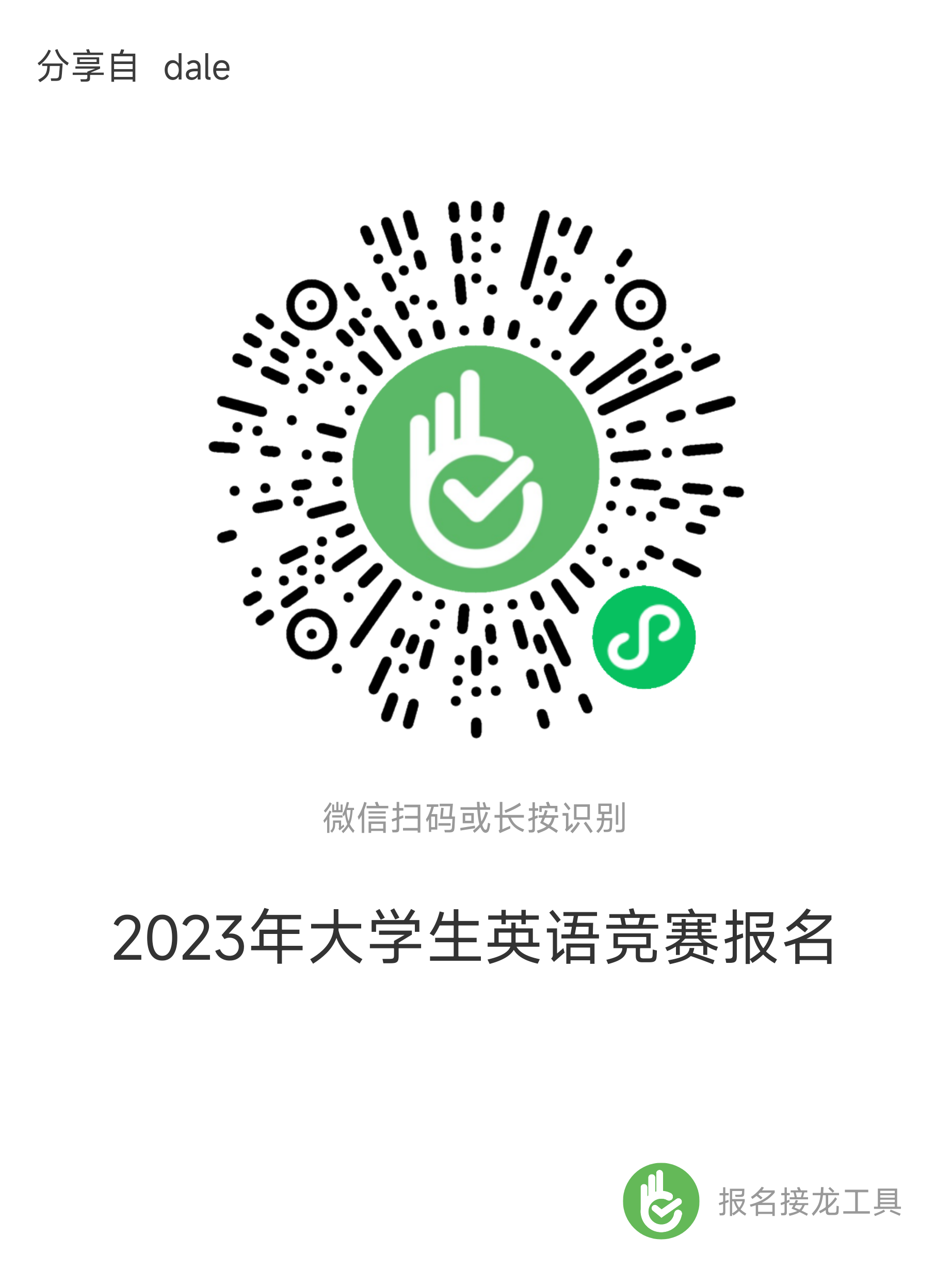 1. 报名:从2023年3月9日-2023年3月31日,通过报名接龙(微信“接龙工具”小程序,链接://rl.uil.ink/?r=YJ9rJuXJe或者识别下方报名图片)填写参赛学生名单、竞赛类别等信息,每人仅限填报一次,信息务必准确,报名后务必按照校区实名(班级姓名)加入对应的QQ群,群内会发布最新通知信息。报名逾期不候。根据《2023年全国大学生英语竞赛(NECCS)通知》规定,本次竞赛全部收费为50元/人。