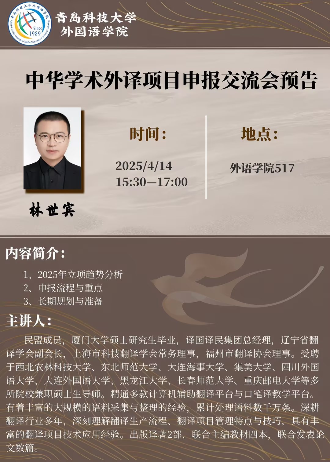林世宾,民盟成员,厦门大学硕士研究生毕业,译国译民集团总经理,辽宁省翻译学会副会长,上海市科技翻译学会常务理事,福州市翻译协会理事。受聘于西北农林科技大学、东北师范大学、大连海事大学、集美大学、四川外国语大学、大连外国语大学、黑龙江大学、长春师范大学、重庆邮电大学等多所院校兼职硕士生导师。精通多款计算机辅助翻译平台与口笔译教学平台。有着丰富的大规模的语料采集与整理的经验,累计处理语料数千万条。深耕翻译行业多年,深刻理解翻译生产流程、翻译项目管理特点与技巧,具有丰富的翻译项目技术应用经验。出版译著