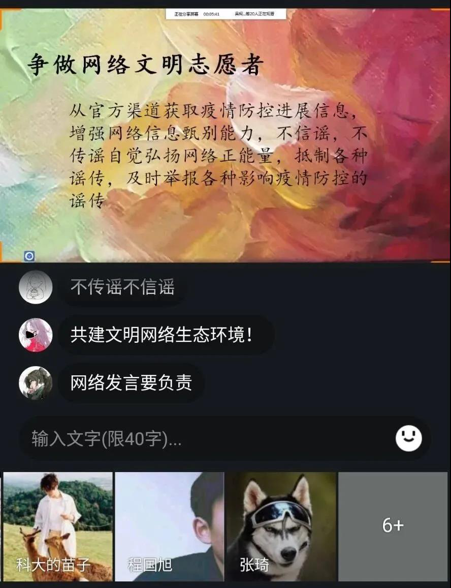 各个班级通过群视频的方式举办了“争做网络文明志愿者”主题教育线上活动。活动主讲人为同学们讲解了网络文明维护各个方面的知识,学习了有关网络宣传管理的有关规定,并结合本次疫情开展了“谣言粉碎机”专栏。主讲人通过辟谣的方式向同学们宣传网络文明,最后发起倡议,争做网络文明志愿者,不信谣,不传谣,自觉弘扬正能量。在此次活动中,同学们认真听讲,同时也激发了他们争做网络文明志愿者的热情,推动了班级队伍的建设,为校园文化发展贡献一份力量。