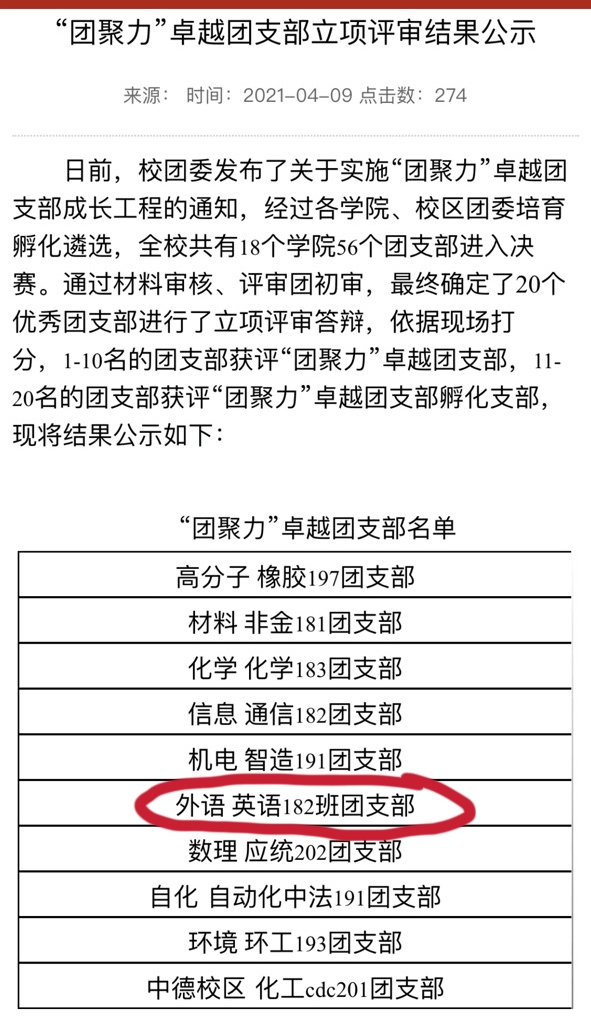 英语182团支部进入答辩决赛并获评“团聚力”卓越团支部。