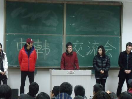 活动开始,09级刘昌和韩国留学生李慧敏作为主持人,分别用韩语和中文介绍了此次交流会。随后韩国留学生们三三两两上台做自我介绍,很可爱的说:你好;很害羞的说:我的中文不好,用最擅长的韩语说吧;很亲切的说:要交到很多的中国朋友。韩国留学生们介绍完了以后,同学们用古筝串烧和歌曲演唱表示衷心的欢迎,韩国留学生们也不甘落后,表演了魅力四射的舞蹈,场下欢呼声一片。精彩又短暂的节目表演后,是大家自由交流的时间。同学们交流的十分投入,现场气氛热烈,许多韩国留学生对中国文化十分向往,对中国人和中国习俗十分着迷,古筝也被韩国留学生们围观拍照,赞叹不已。