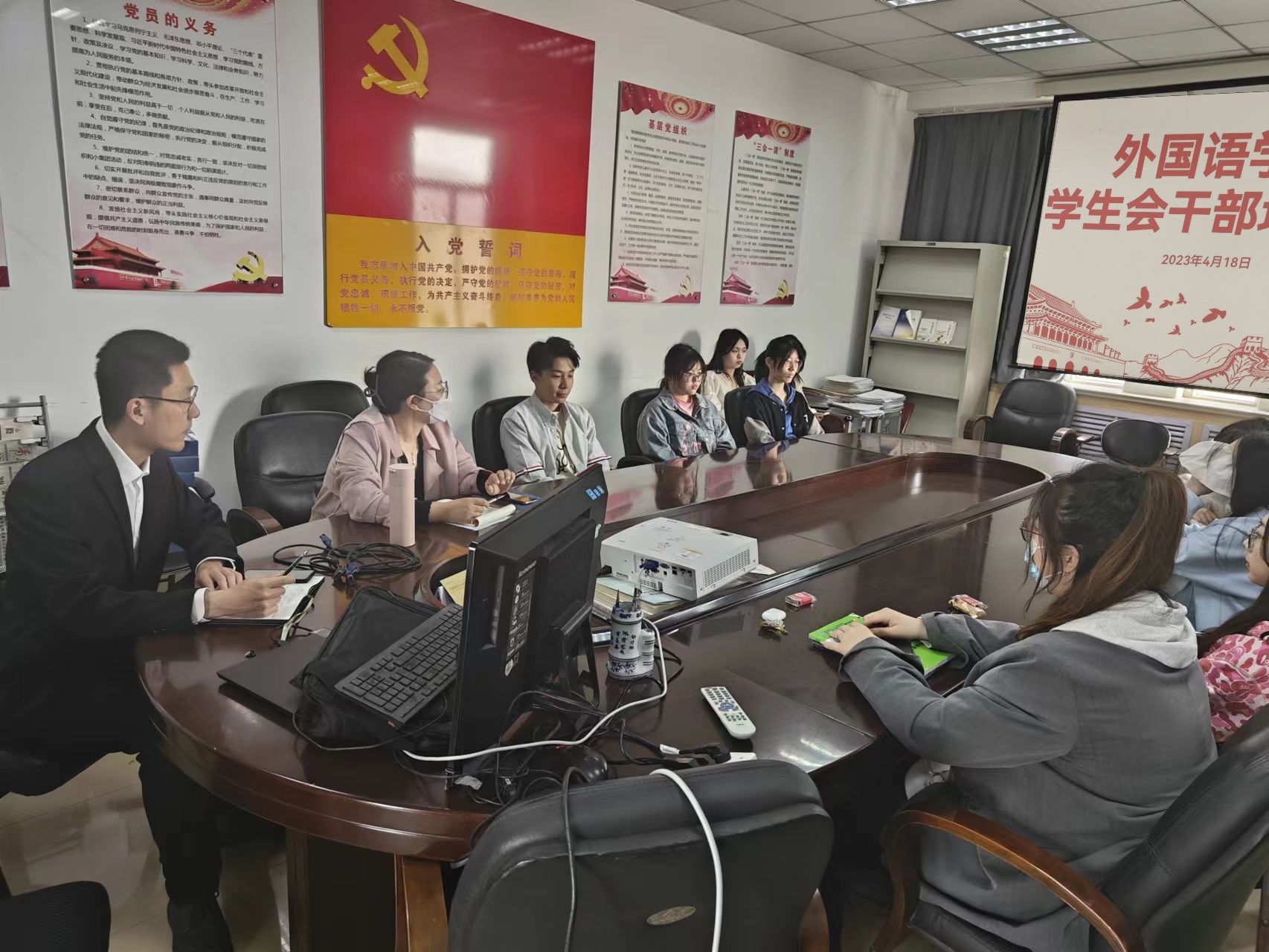 团委书记兼学工办主任刘妍君老师和张湘钧老师于4月18日下午在外院502室组织开展学生会干部培训会,学生会主席和各部门部长参加了会议。