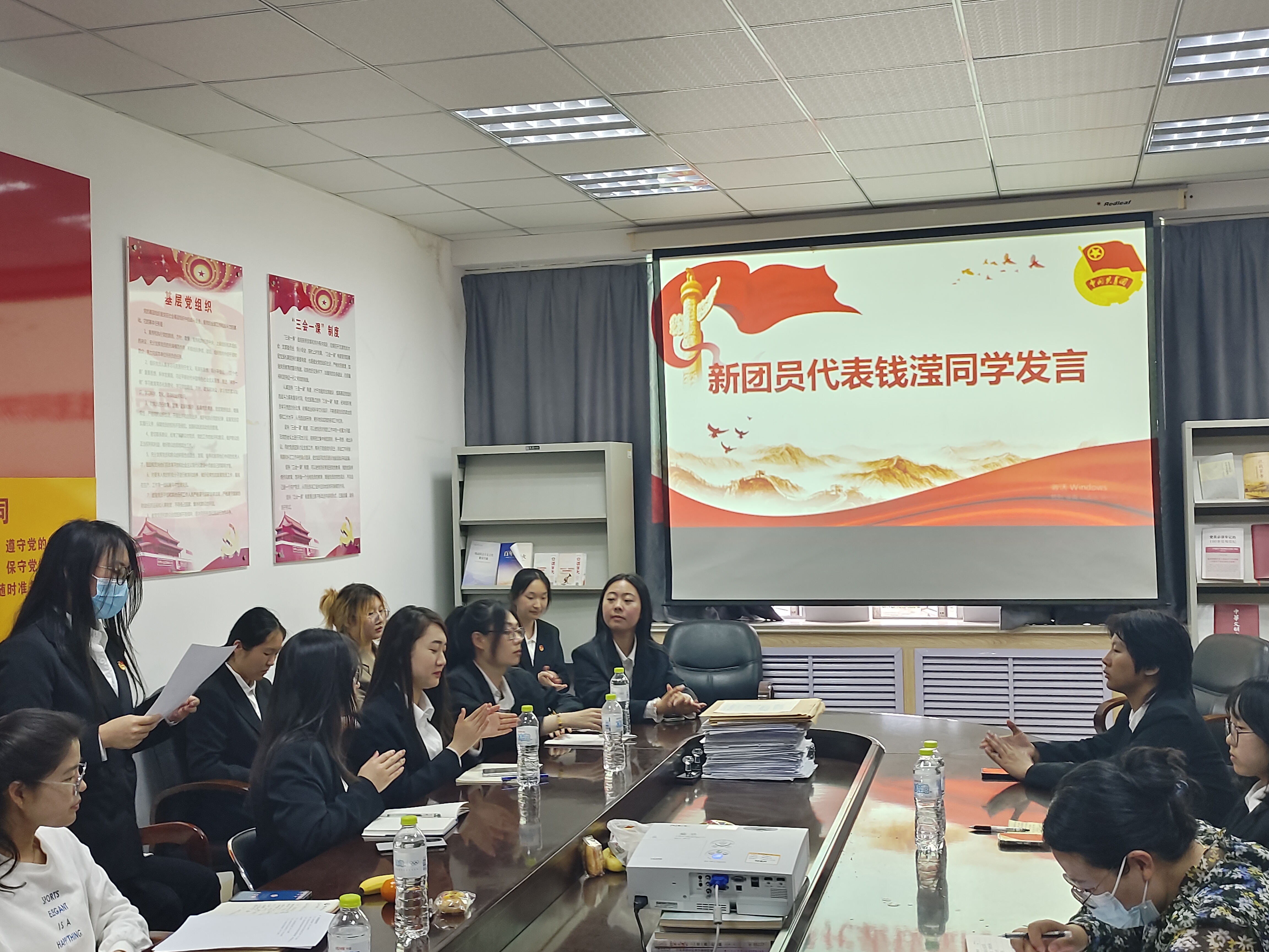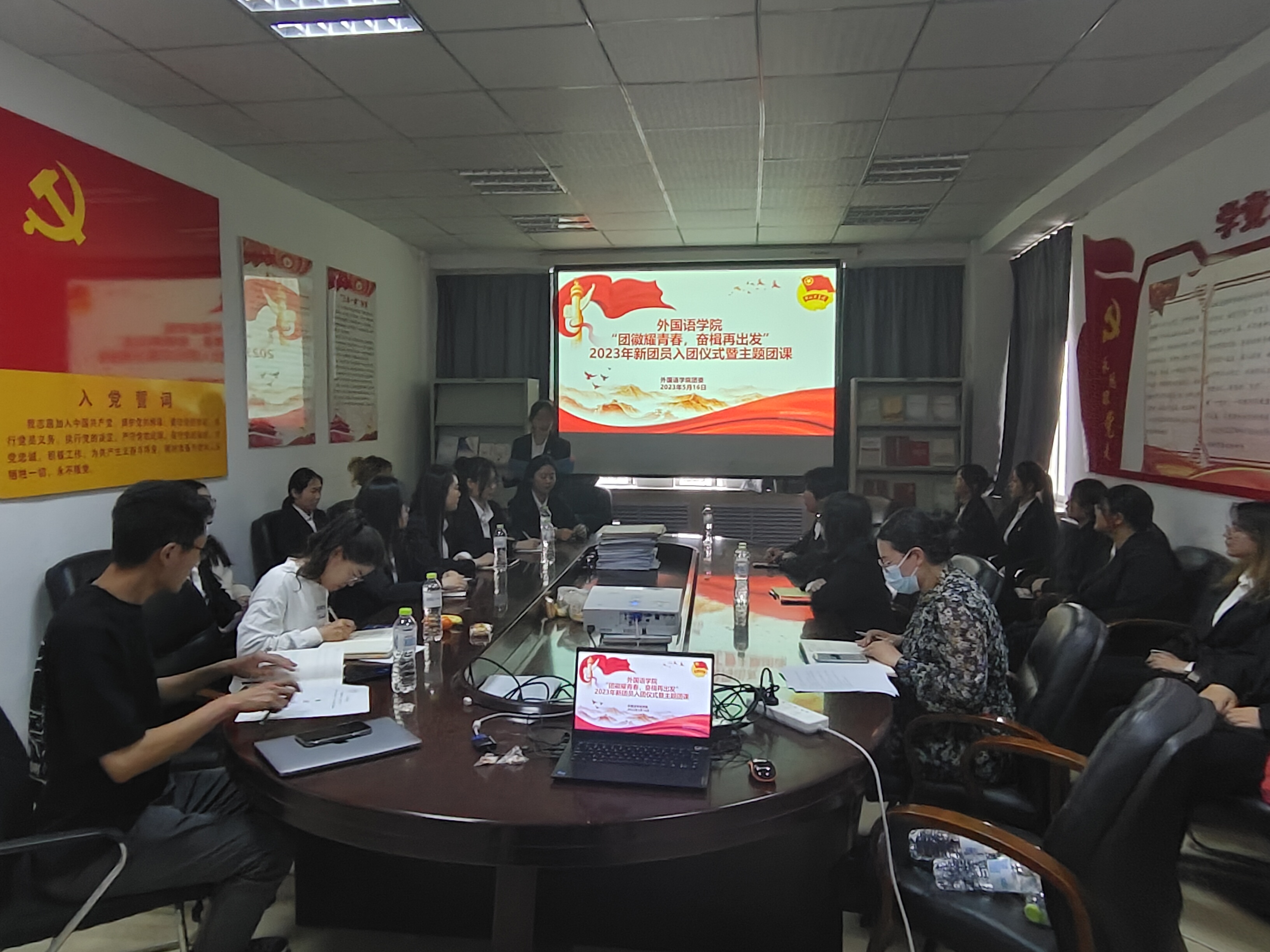 团委在学院楼502会议室举行“团徽耀青春,奋楫再出发”主题团课暨2023年新发展团员入团仪式。出席本次活动的有学院全体团委老师,两位新团员以及2022级全体班长、团支书。