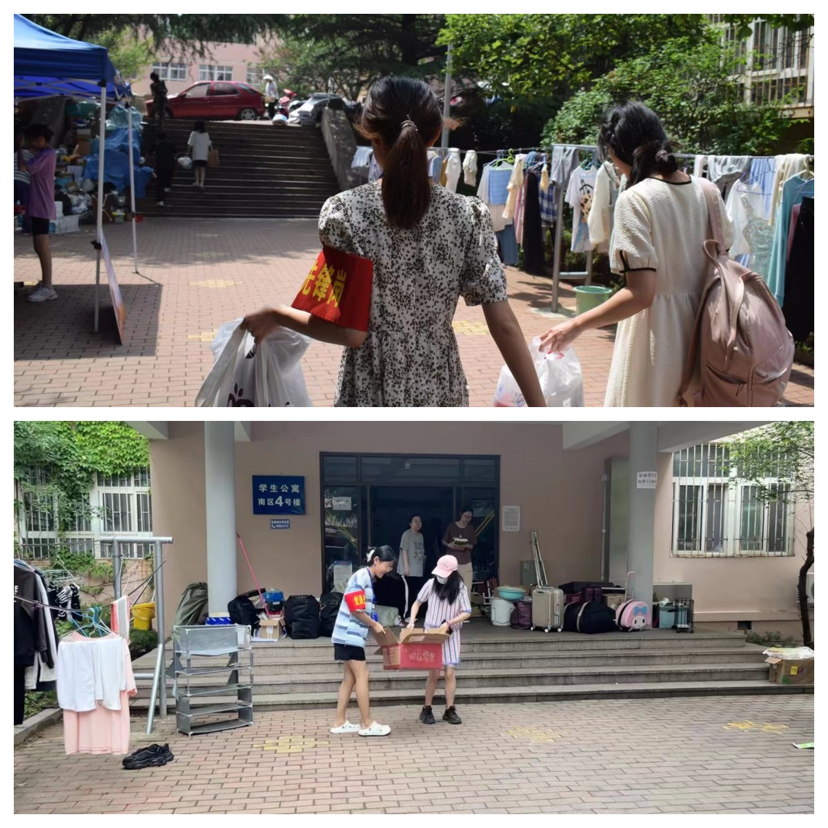 在毕业生离校之际,学生党员和入党积极分子们戴上工作证和“党员先锋岗”的红袖章,以积极的态度与满腔的热情,在宿舍楼区域进行志愿服务,帮助毕业生们转运行李与物品。志愿者们用实际行动发挥学生党员的责任与担当,展现出无私奉献的志愿服务精神,用心用情为同学们服务。