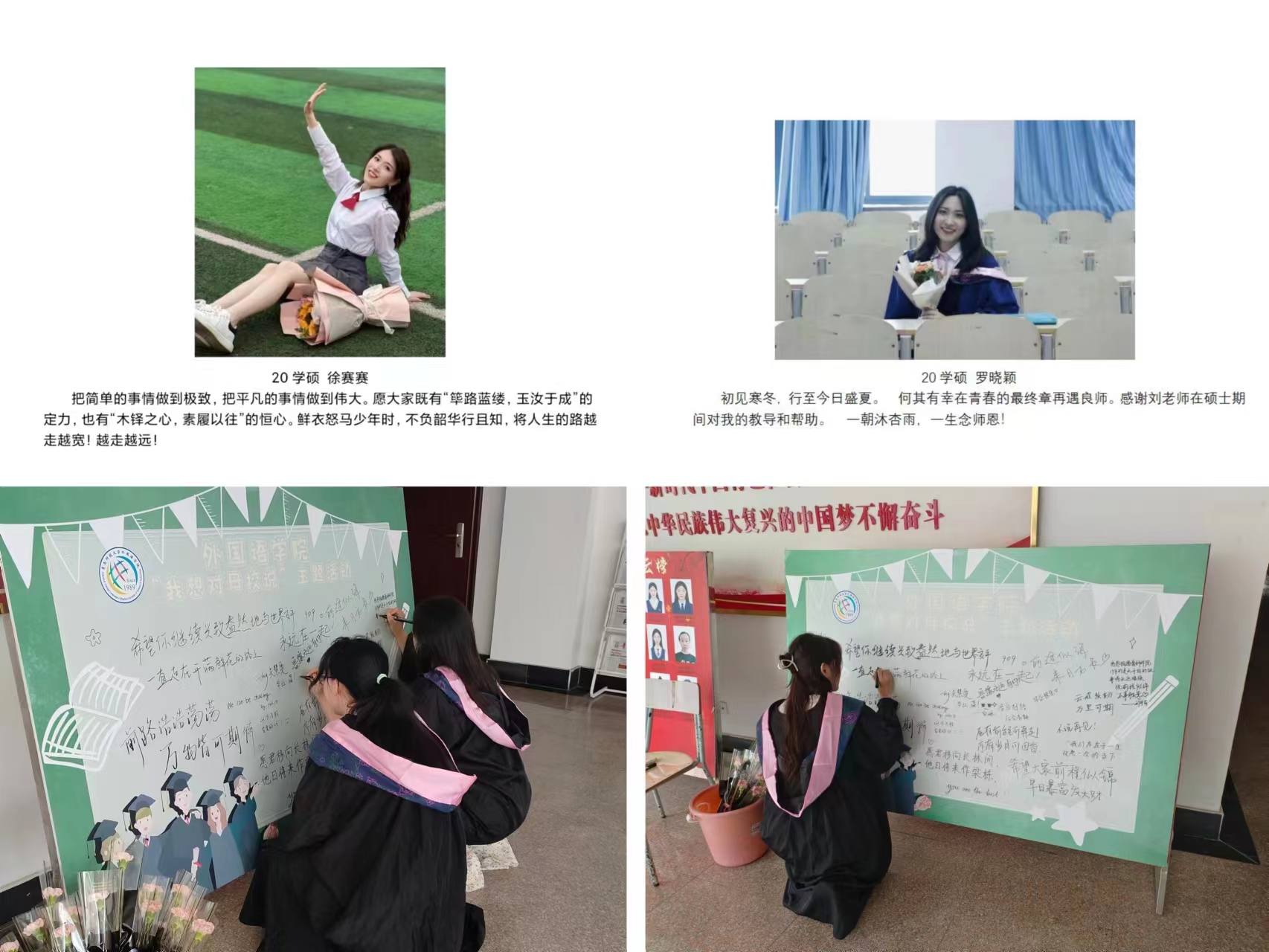 学院开展了“我对母校有话说”主题活动,毕业生们积极参与,以多种形式留下毕业感言和寄语,对学弟学妹提出殷切盼望,诉说对母校的美好祝愿和别离的不舍情愫,同时学院以鲜花相赠,祝福毕业生毕业快乐。