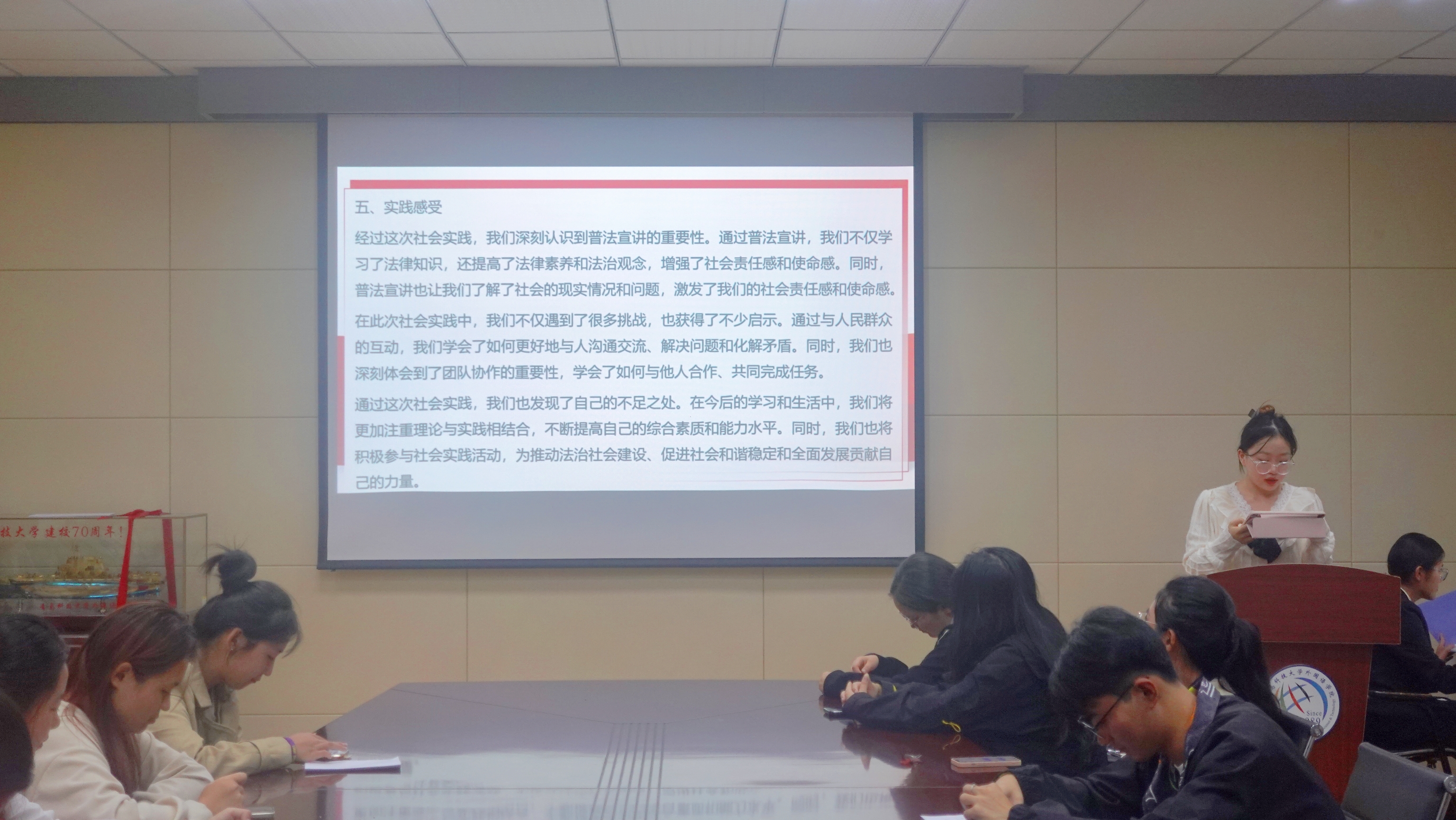 本次座谈会特别邀请了校级社会实践优秀团队代表德语211王茜琳同学为同学们展示了她所在的“‘懂法守法,普法传法’动漫网站