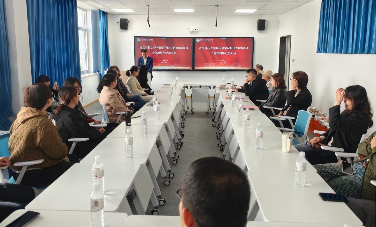 日语2002级1班毕业20周年纪念大会在学院413会议室隆重举行。学院党委书记曲斌艳、日语系主任班健、团委书记王玉凯、教师代表与日语021班校友欢聚一堂,共叙师生情谊,共话未来发展。