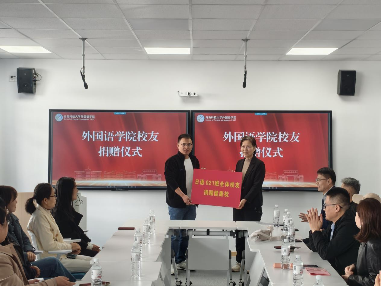纪念大会上,日语021班校友向学院捐赠健康枕,表达对母校的深厚情谊和美好祝愿。党委书记曲斌艳代表学院接受捐赠,感谢校友们对学院师生的关爱。